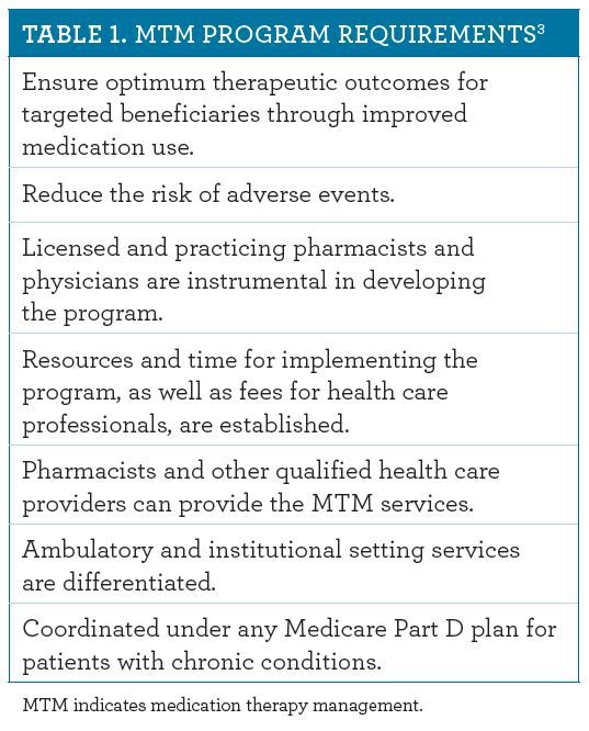 Medication therapy management (MTM) has become an integral part of the pharmacist’s role in disease state management. The term “MTM” was first coined following passage of the Medicare Prescription Drug, Improvement, and Modernization Act of 2003 as part of implementing Medicare Part D. 1 The American Pharmacists Association (APhA) helped establish and define MTM and the activities that encompass its services. MTM is also defined as a distinct service or group of services that enhance therapeutic outcomes for patients. 2 These services include medication assessment, identification of drug-related issues, and strategies to resolve problems.
