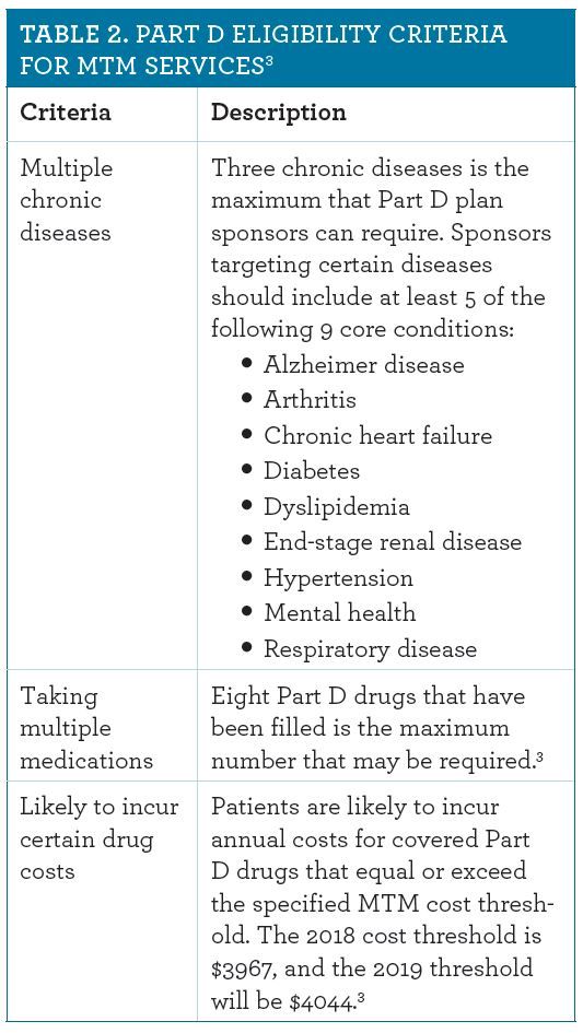 Generally, individuals are considered eligible for MTM services under Part D if they meet the following 3 criteria (Table 2) 3 :